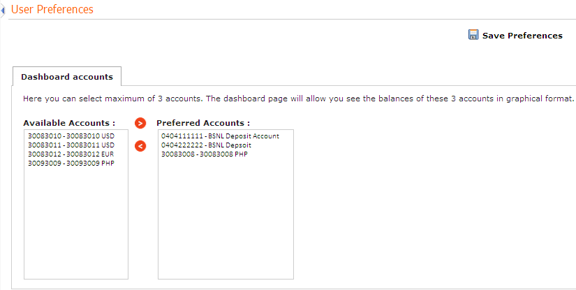 Used to select accounts for viewing the balances in graphical format, on the dashboard page. You can also change the password questionnaire according to your preferences. |
