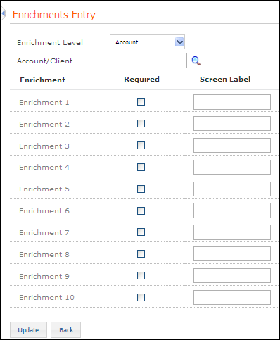 · Screen Label: Indicates the enrichment field label as you want it to appear on the screen.